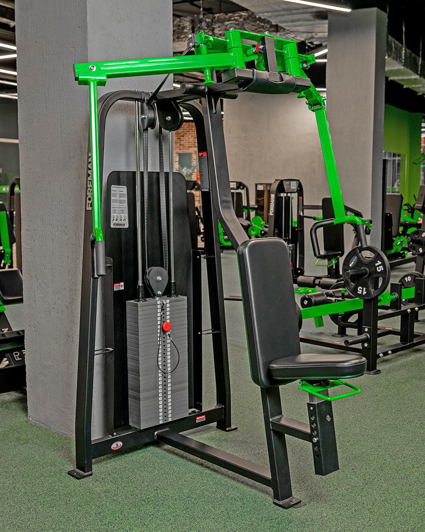 Баттерфляй. Исполняемое движение: сведение рук. Тренируемая группа мышц: большая грудная, трицепс, передние дельты.