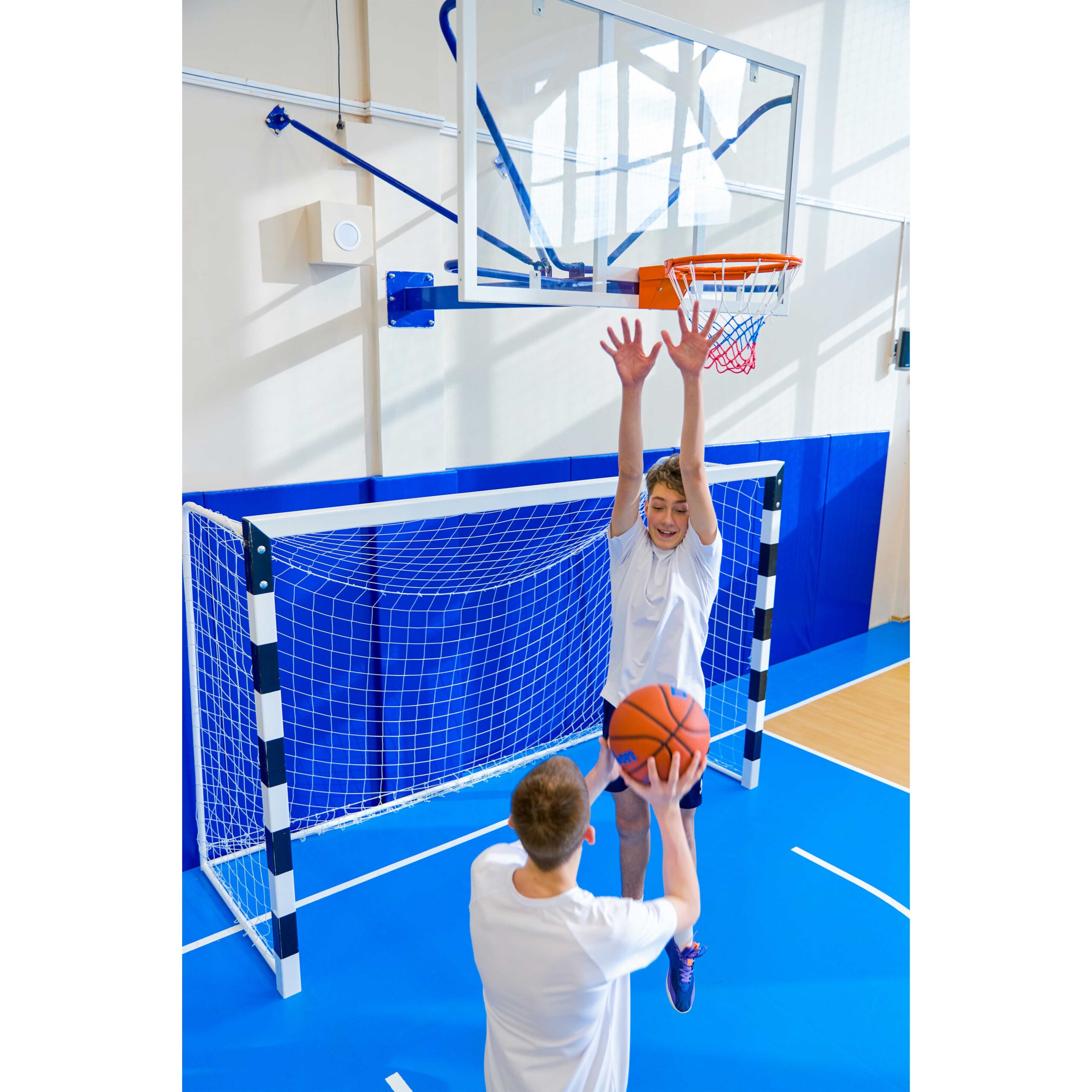 Баскетбольное кольцо устанавливается на высоте 3,05 метра от пола.