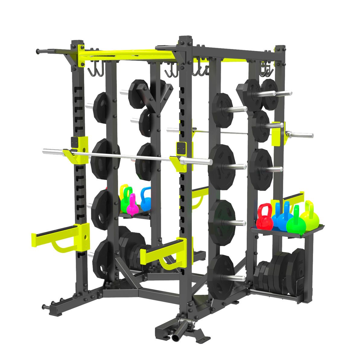 A3081 RUS Силовая рама (Power Cage) Легко модифицируемая в процессе тренировки силовая рама станет надежной опорой для тренировок со штангой. Кронштейны для поддержки грифов легко перемещаются вверх-вниз по раме, в зависимости от роста и потребностей спортсмена. Штифты для хранения дисков располагаются на различных уровнях, что позволяет быстро добавить или снизить вес снаряда. Свободная конструкция рамы позволяет установить скамейку для выполнения упражнений «жим лежа» и «жим сидя». Также рама снабжена специальными хватами, для выполнения подтягиваний или иных упражнений.