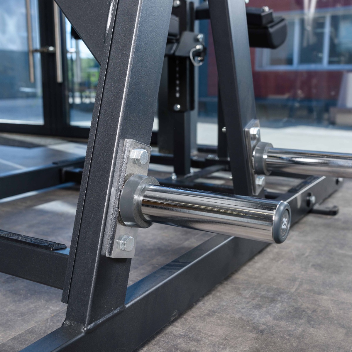 Количество хромированных накопителей для хранения свободных весов: 6 штук из толстостенной стальной трубы диаметром 48 мм. Максимальный вес на накопитель: 100 кг.