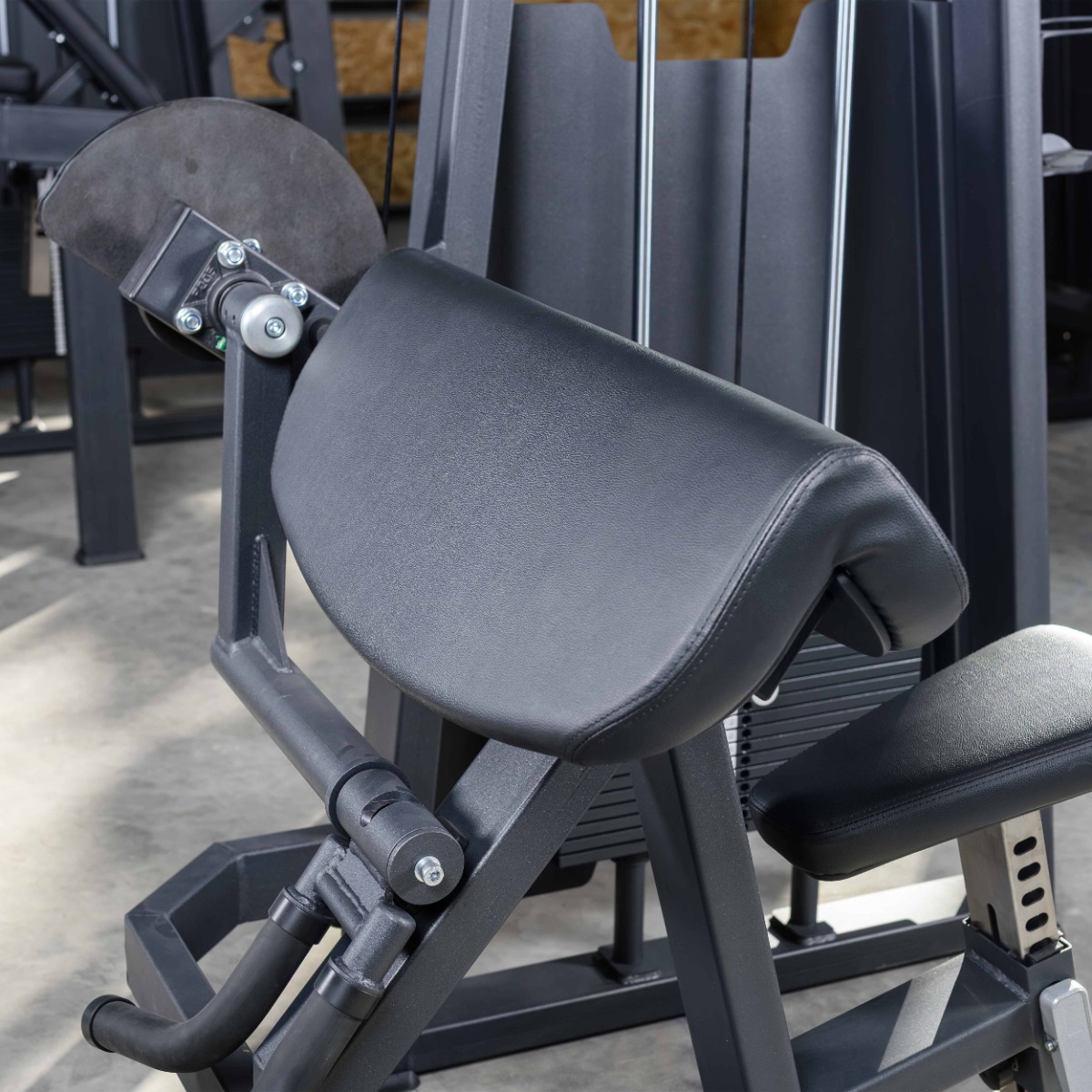 Опорная парта для рук имеет увеличенную ширину и наклон, что способствует правильному положению плечевого сустава и изоляции бицепсов при выполнении упражнения.