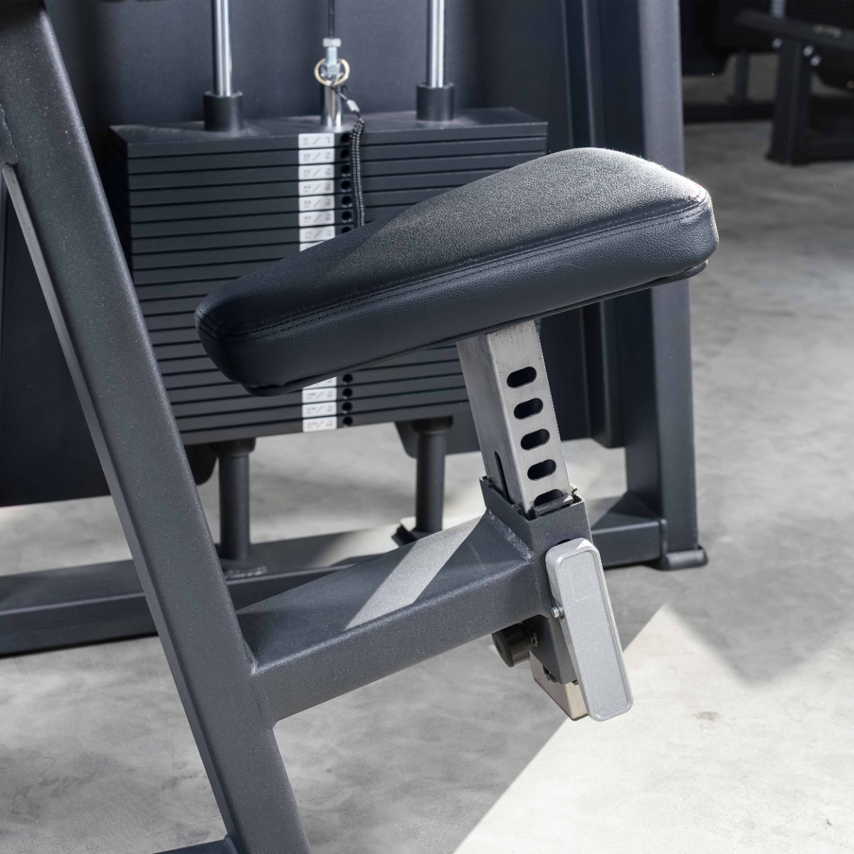 Система нагрузки – тросовая, с весовым стеком 100 кг. Весовой стек выполнен из стальных плит с порошковым покрытием.