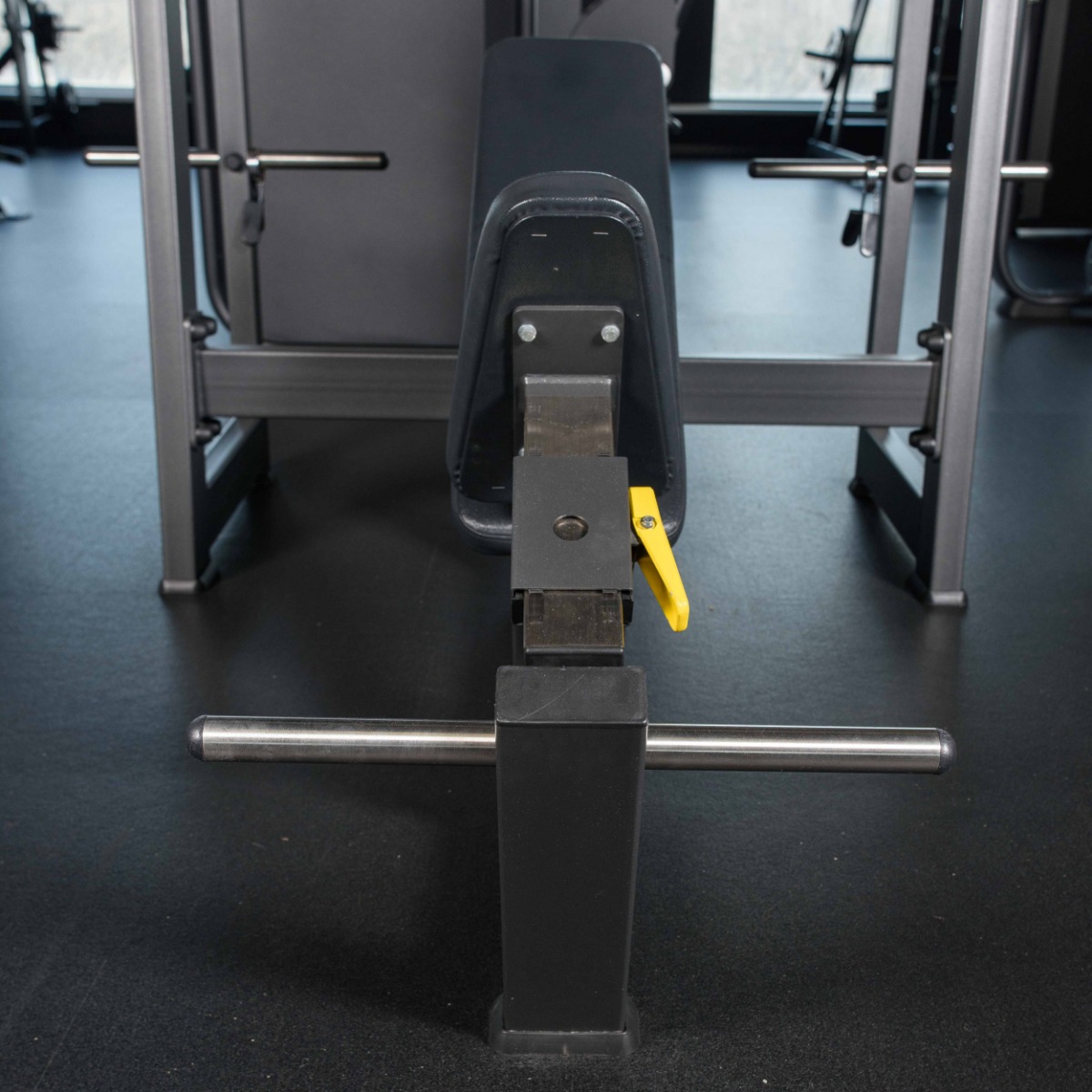 Фиксаторы для ног выполнены в виде хромированной поперечной трубы с пластиковыми заглушками, обеспечивающей устойчивое положение спортсмена при выполнении упражнения.