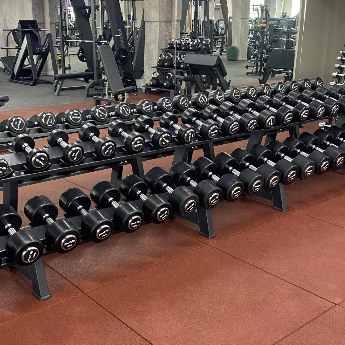На каждой полке установлены чашеобразные пластиковые ложементы (всего 40 шт.), обеспечивающие надёжную фиксацию гантелей и предотвращающие повреждение поверхности полок.