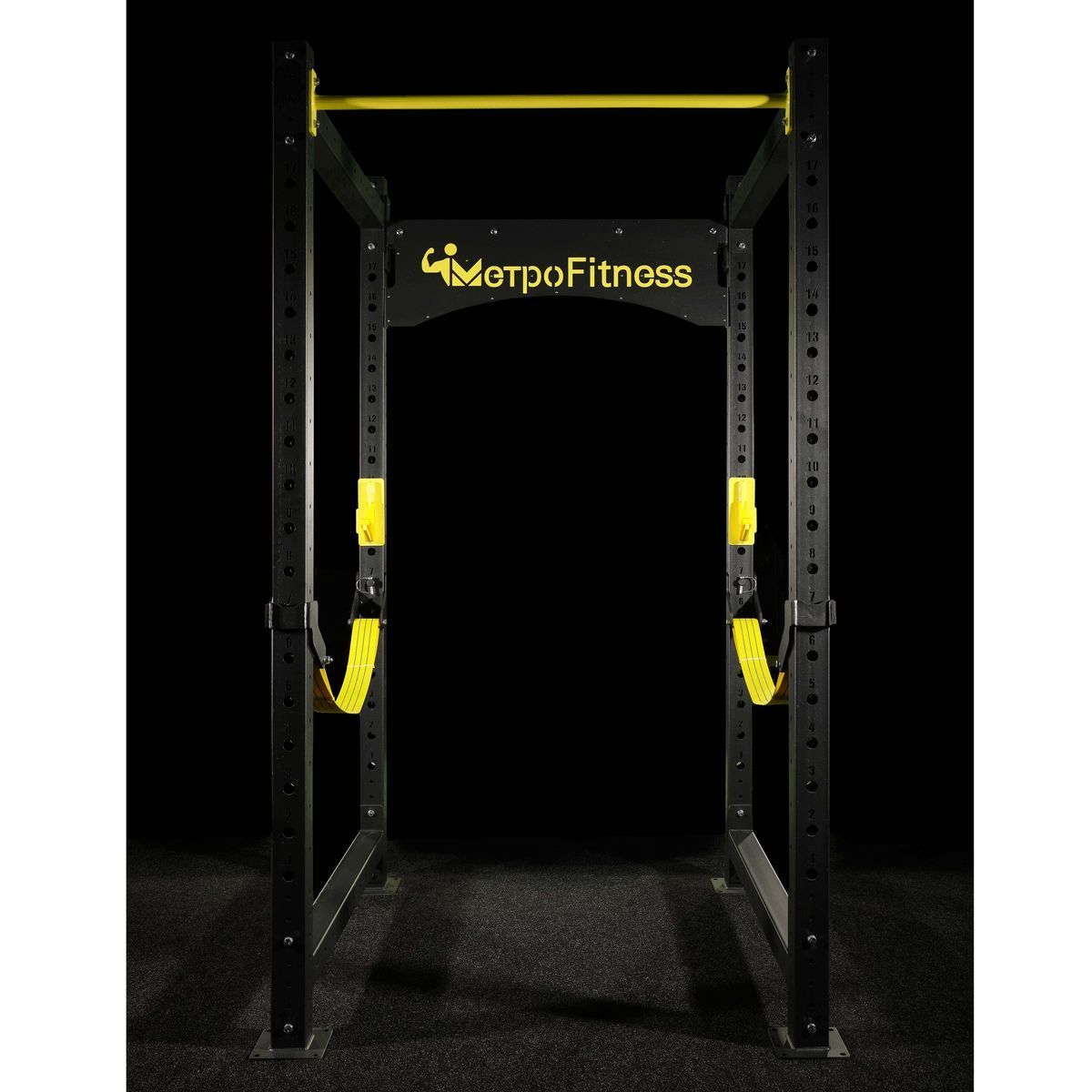 Силовая рама оснащена регулируемыми по высоте страховочными упорами и фиксаторами для штанги, которые можно подстраивать под рост спортсмена или под конкретные тренировки, так же это позволяет установить скамью для выполнения упражнения жим из положений сидя или лежа. Вверху силовой рамы расположен турник. Страховочные упоры сделают упражнения со штангой более безопасными и менее травмоопасными для спортсменов.