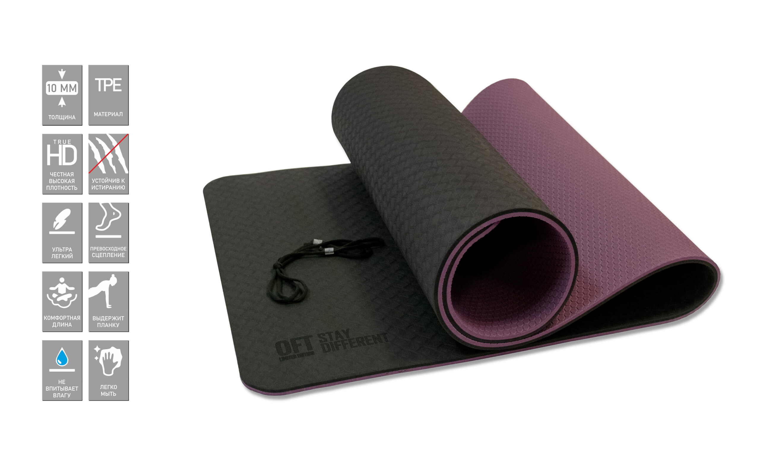 - Удобен для большинства упражнений в пилатес, йоге, стрейчинге и миофасциальном релизе (МФР).