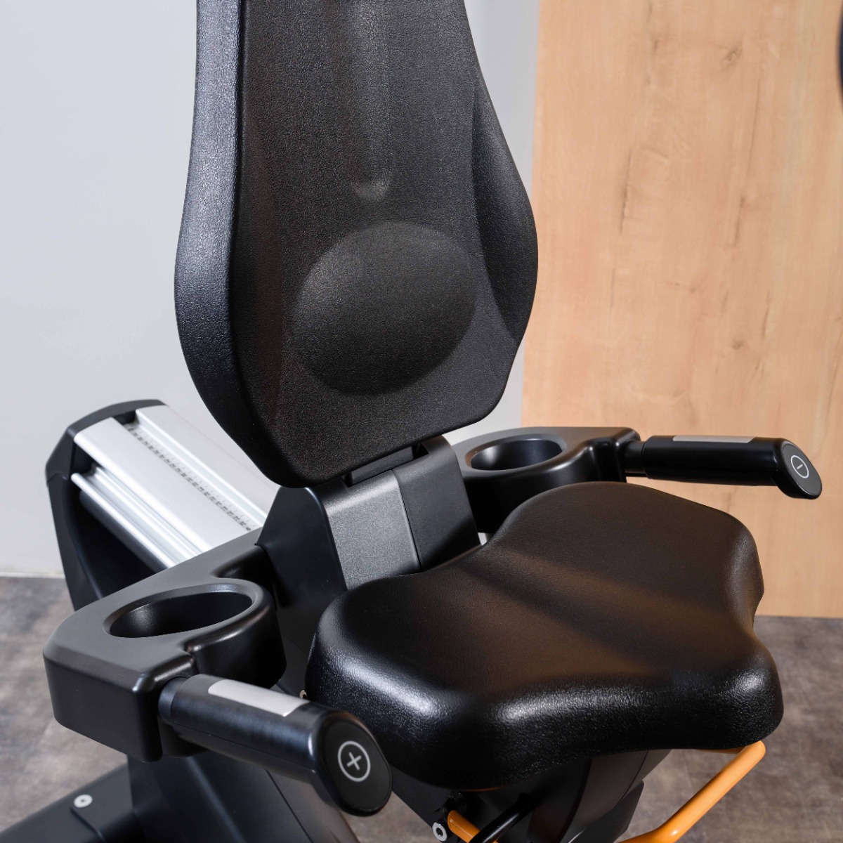 Рукоятки расположены вдоль сиденья, оснащены парой датчиков пульса и клавишами регулировки нагрузки на торцах.
