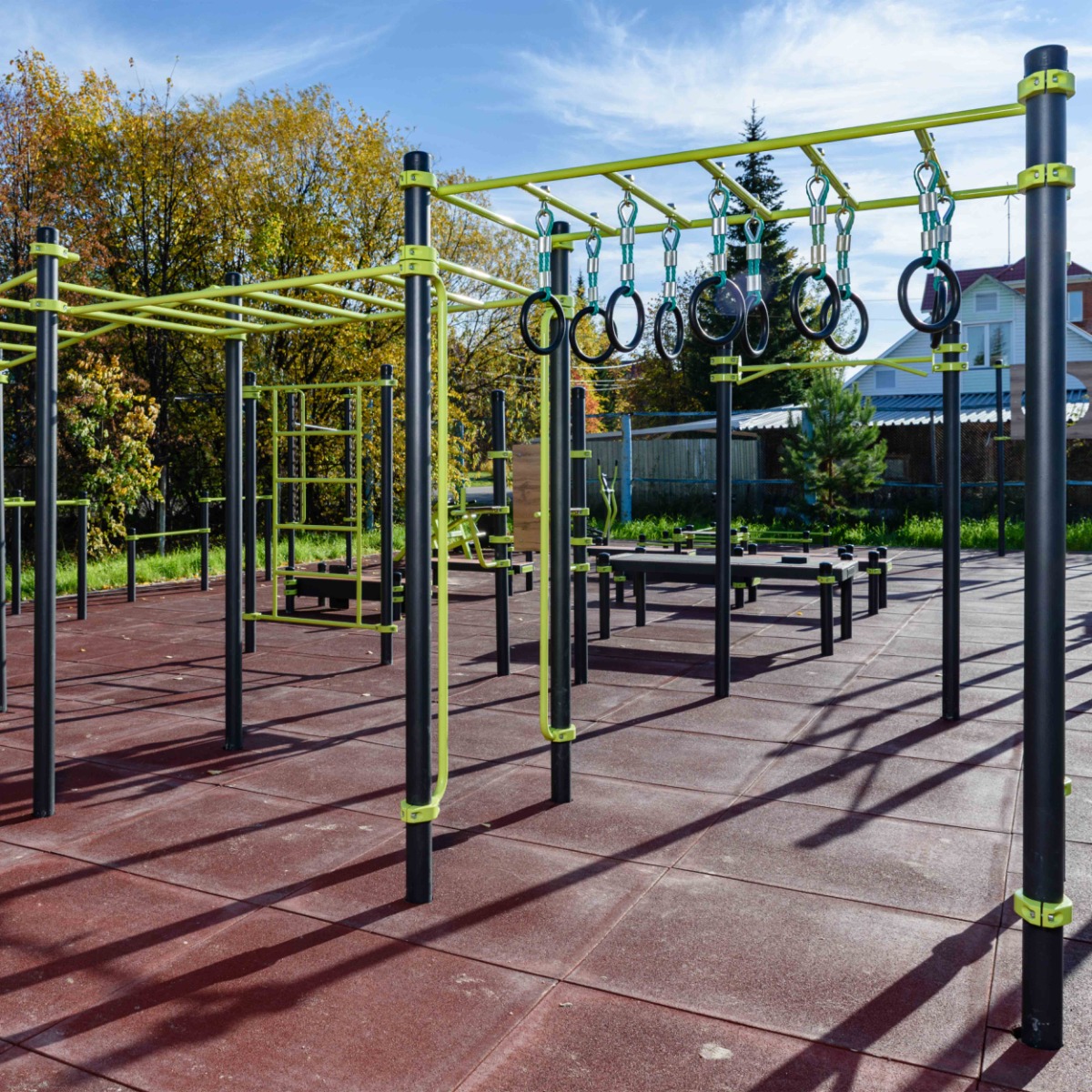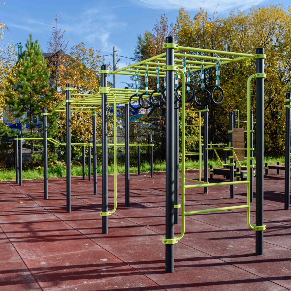 Рукоходы классический и в подъём, рукоход с кольцами, перекладины вертикальные и низкая шведская стенка выполнены из металлической трубы диаметром 34 мм с толщиной стенки 3,2 мм.
